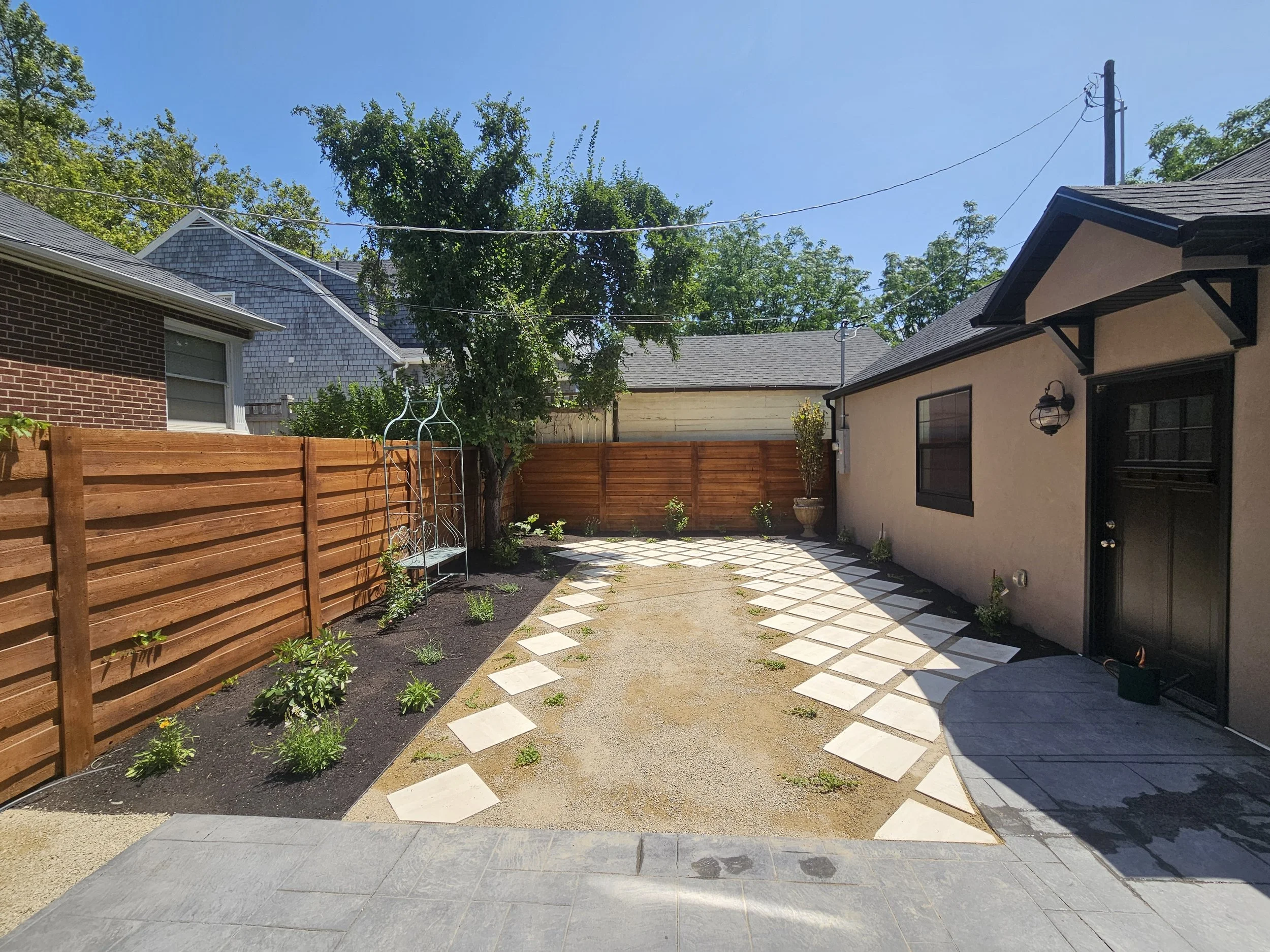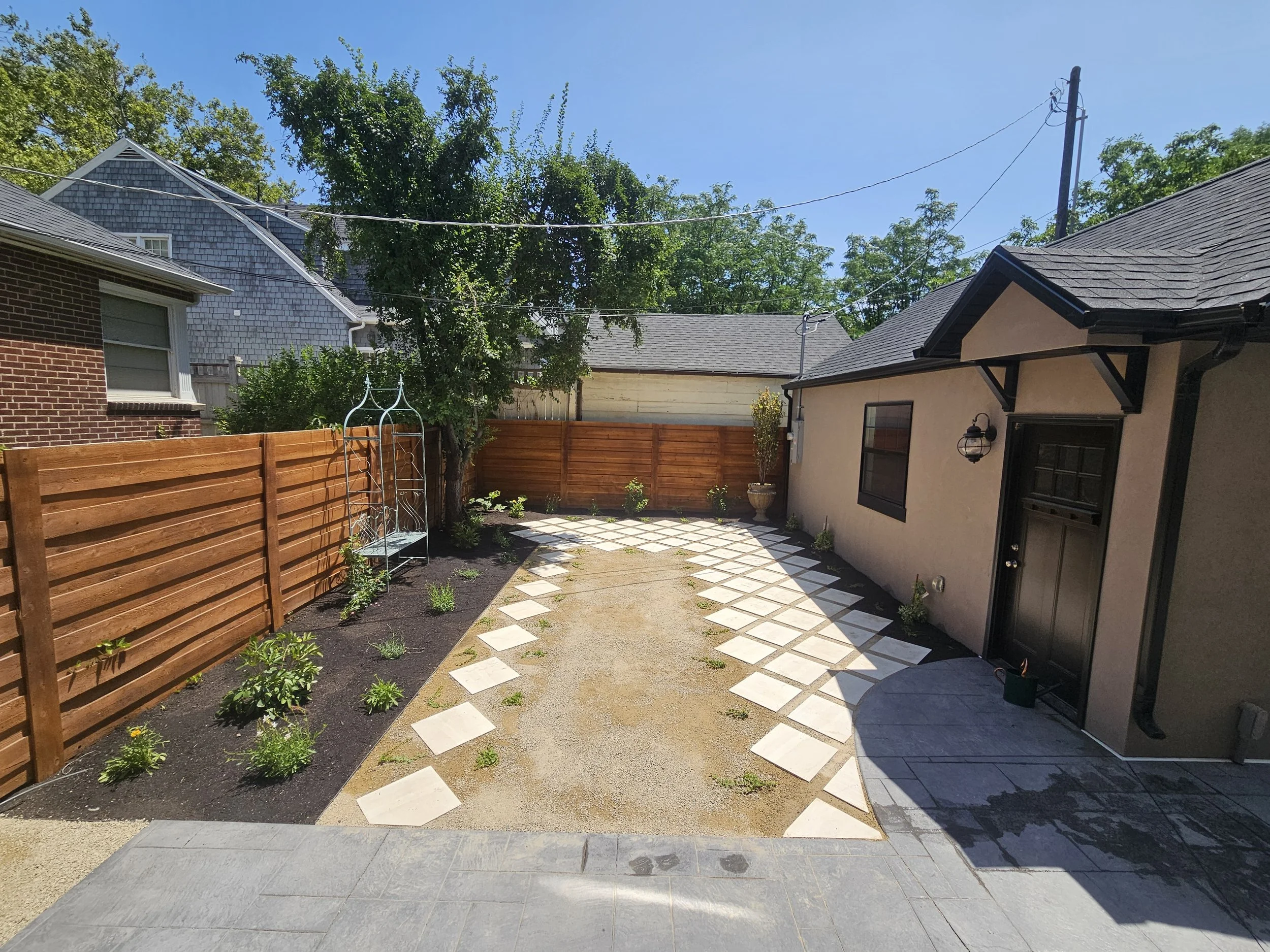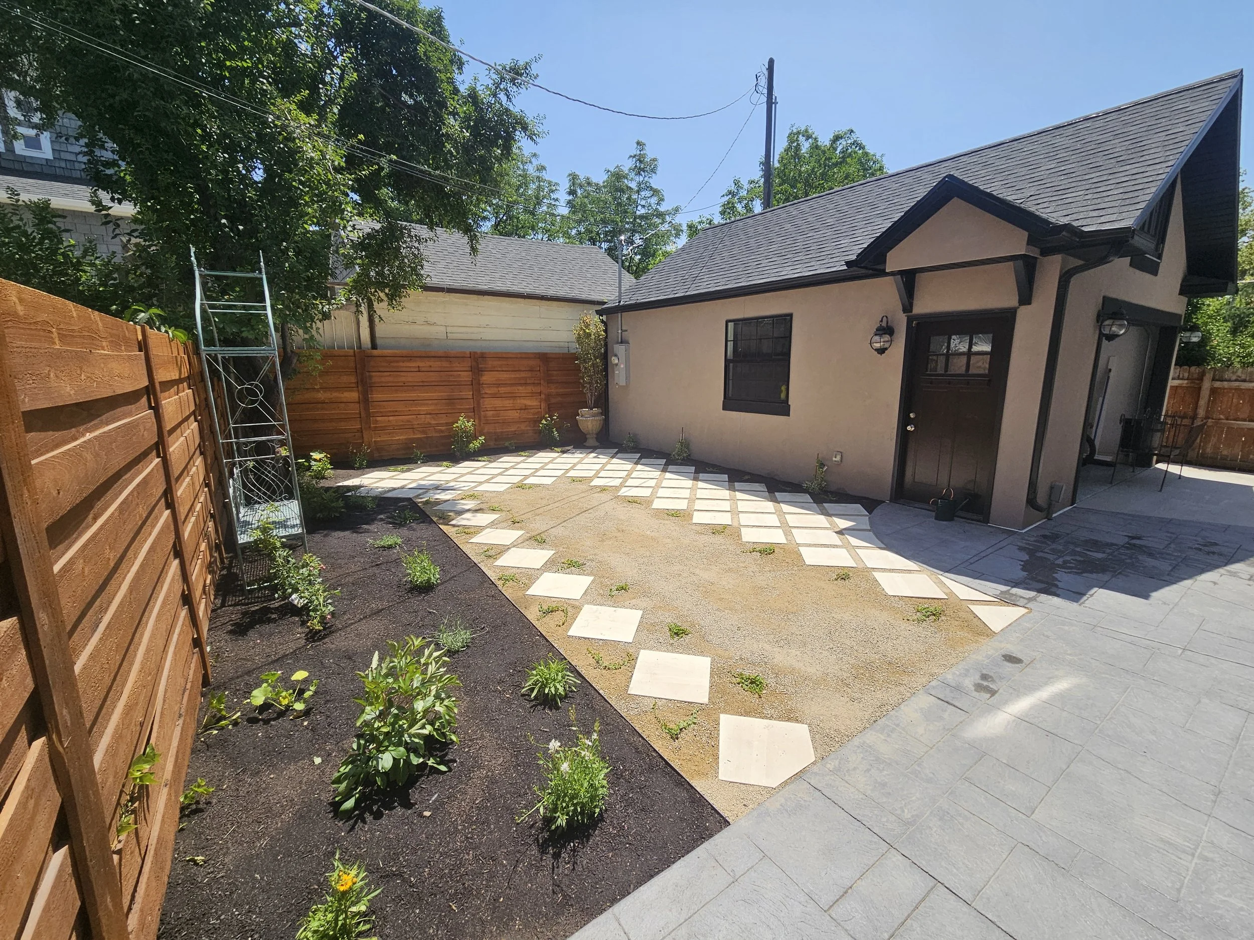 Take a look at this backyard that we transformed from a dry dirt patch to a beautiful, low-water European outdoor space water-wise lawn flip we did in Salt Lake City, Utah.