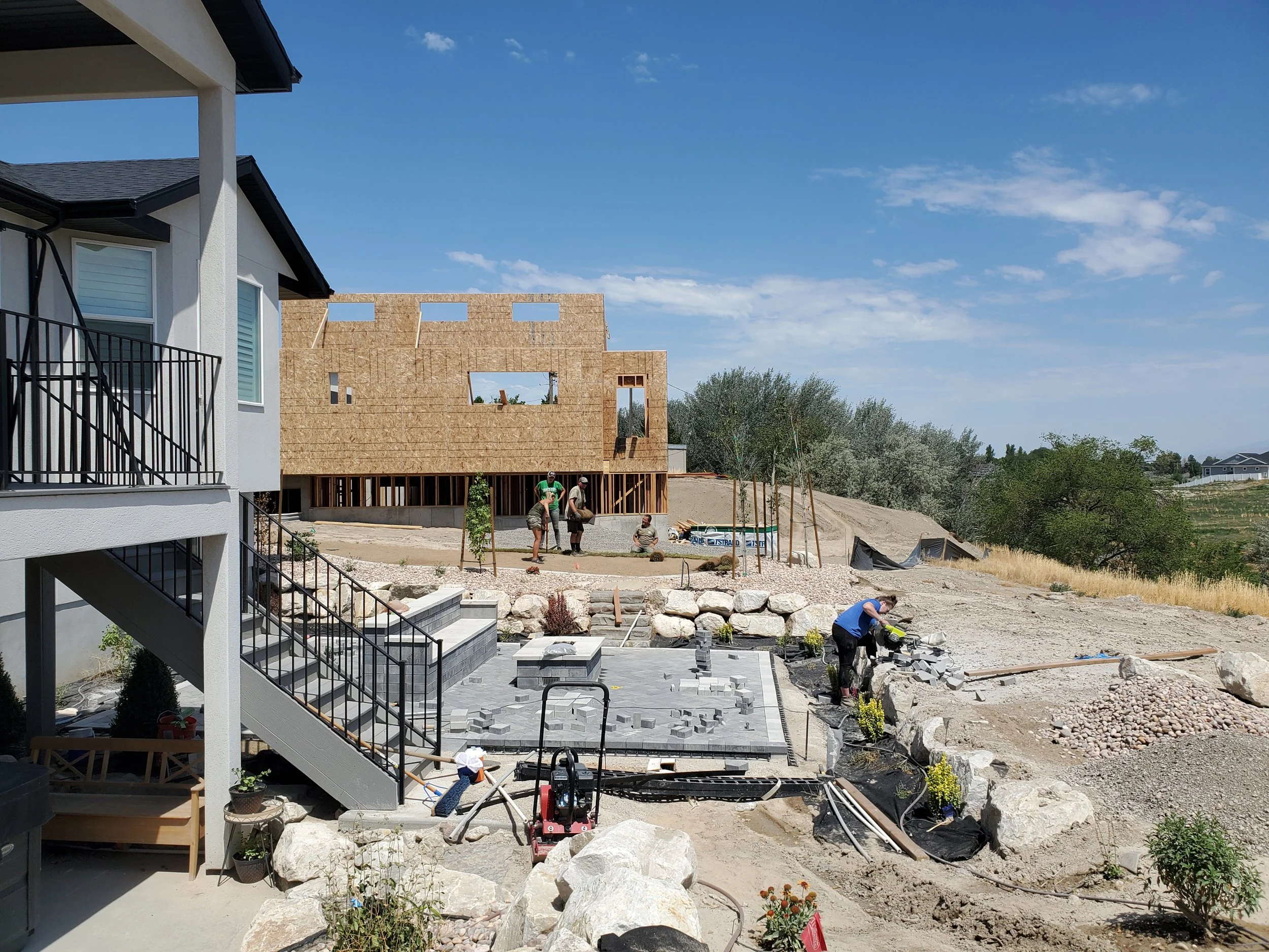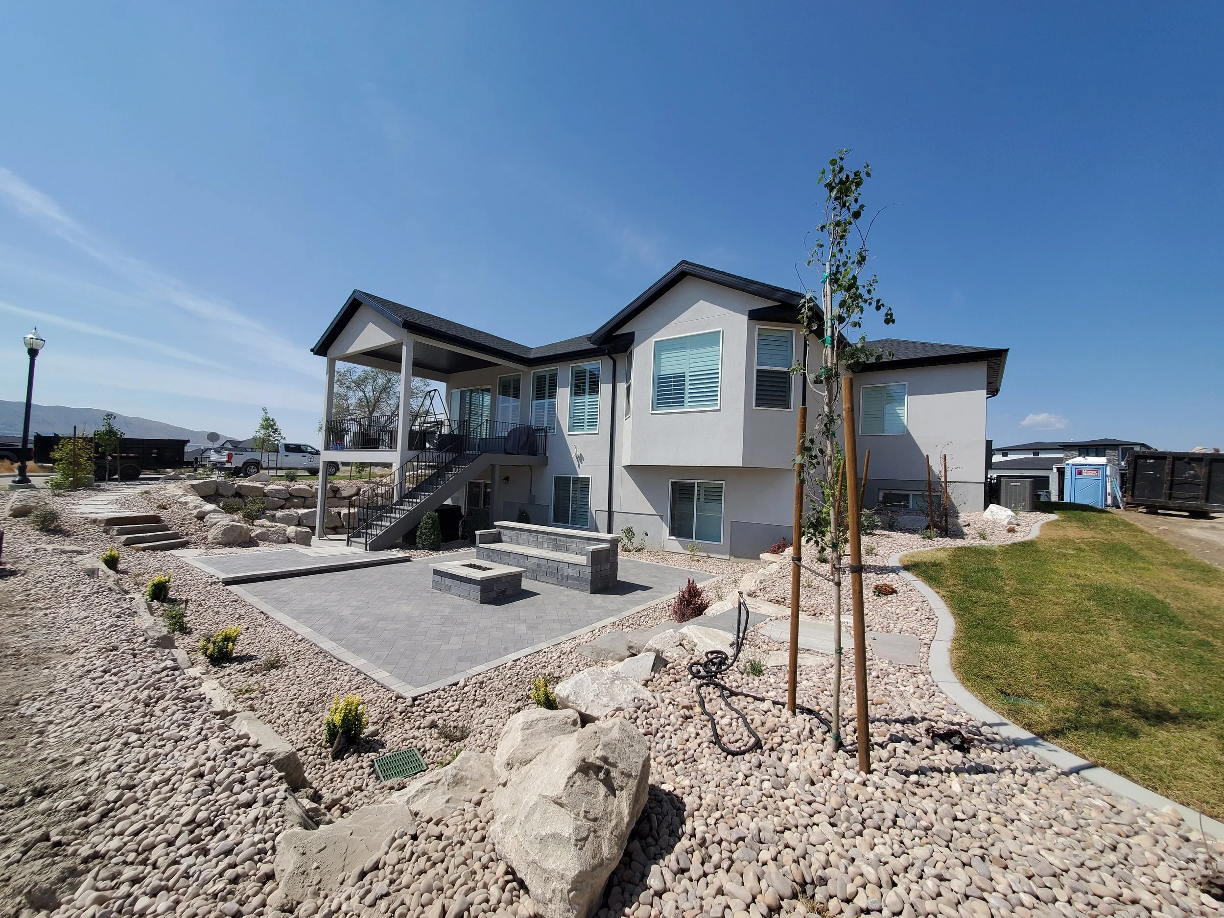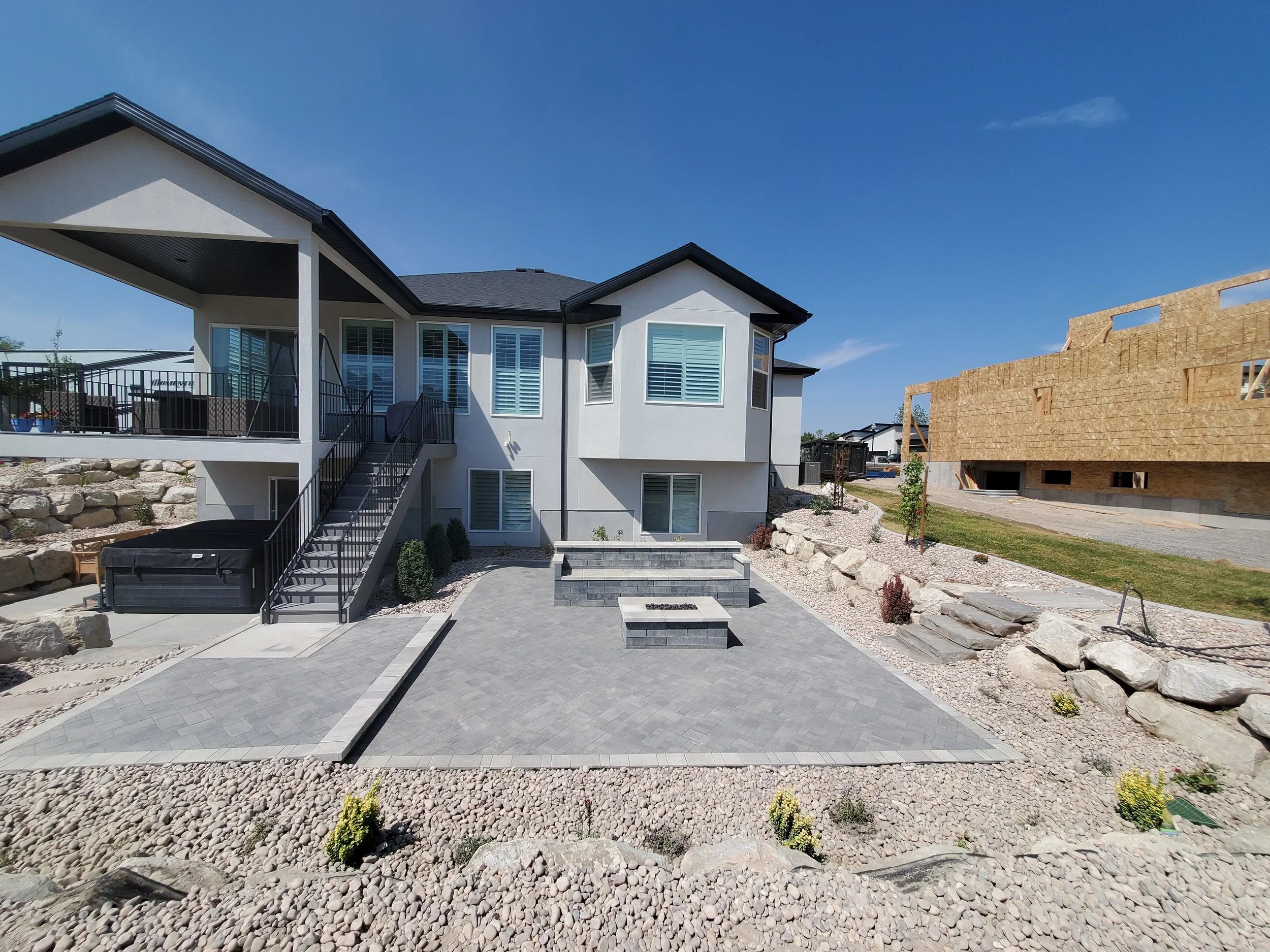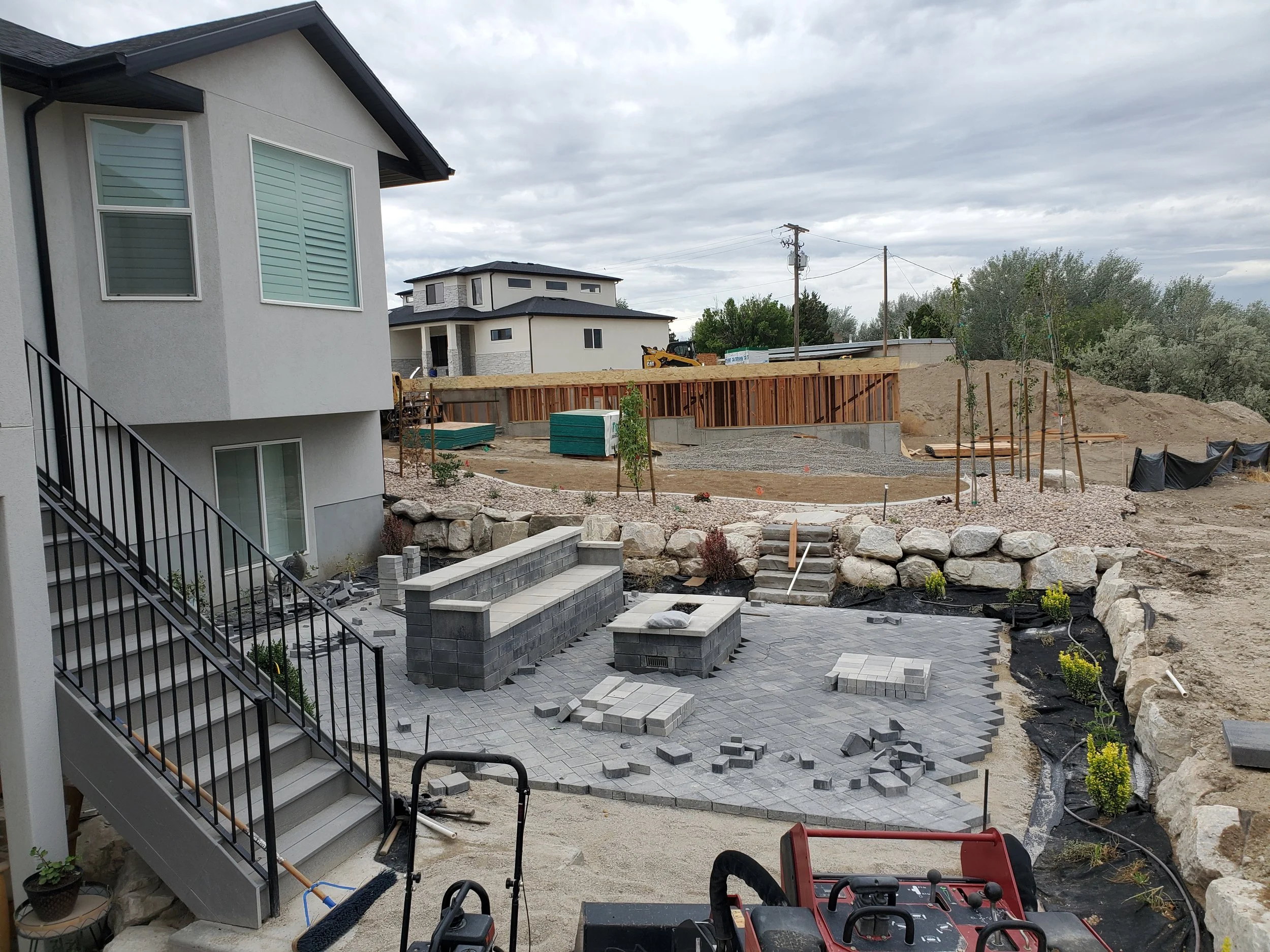 We had a wonderful opportunity to completely design the yard for this new lot build. The true prize of the yard, however is the natural gas firepit with a custom paver block bench with back rest, surrounded by pavers in a herringbone pattern.