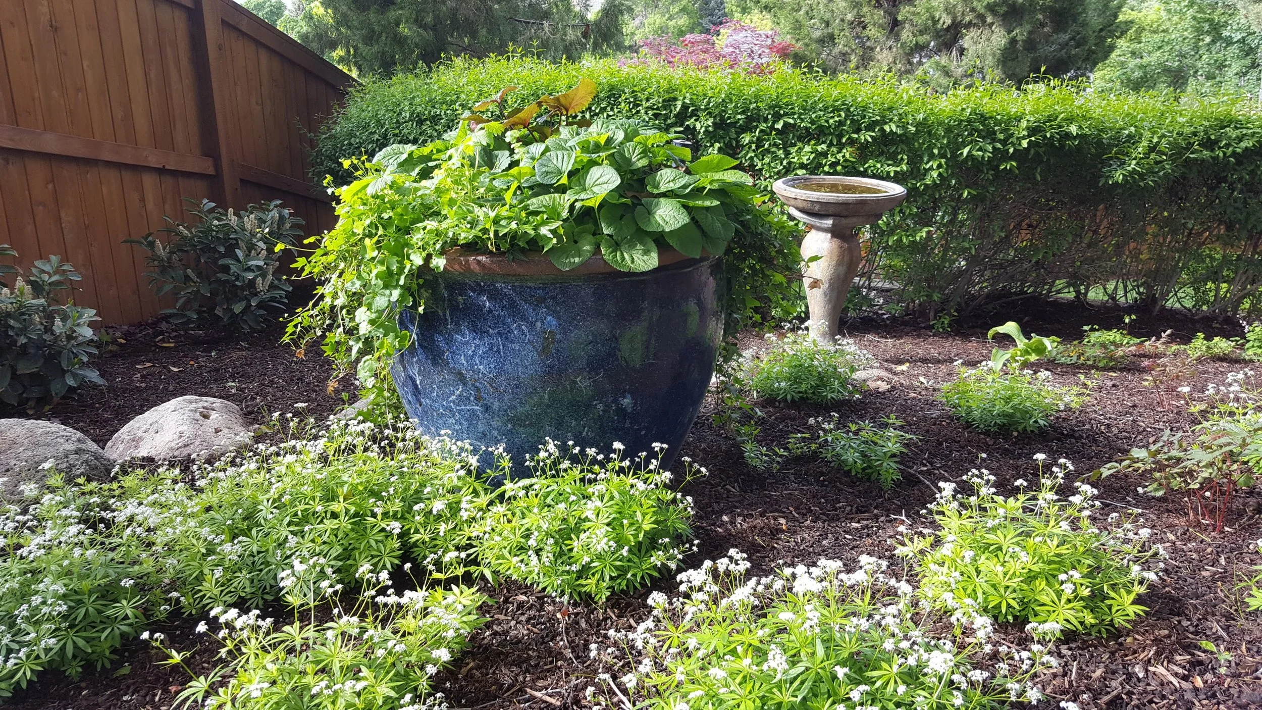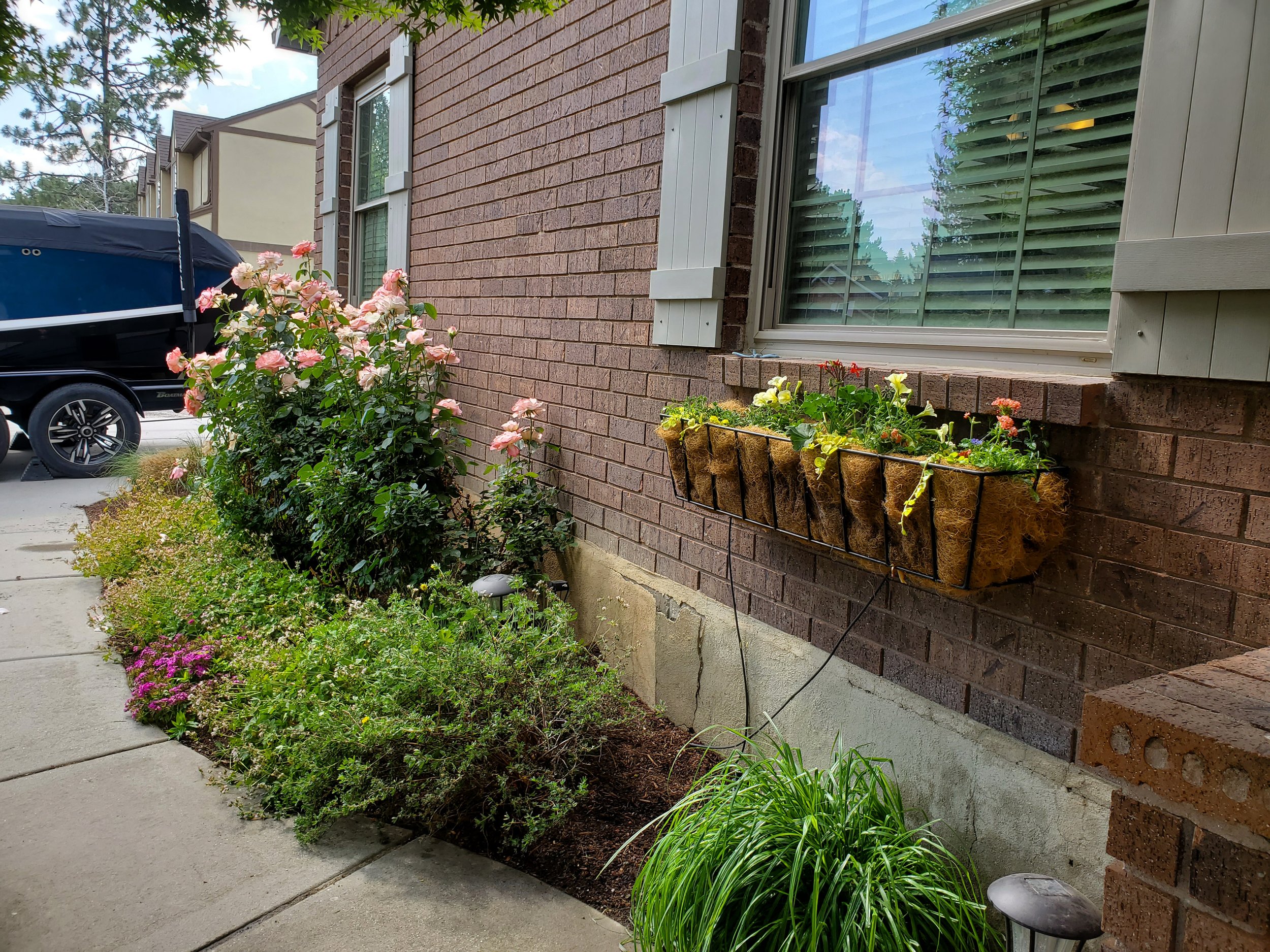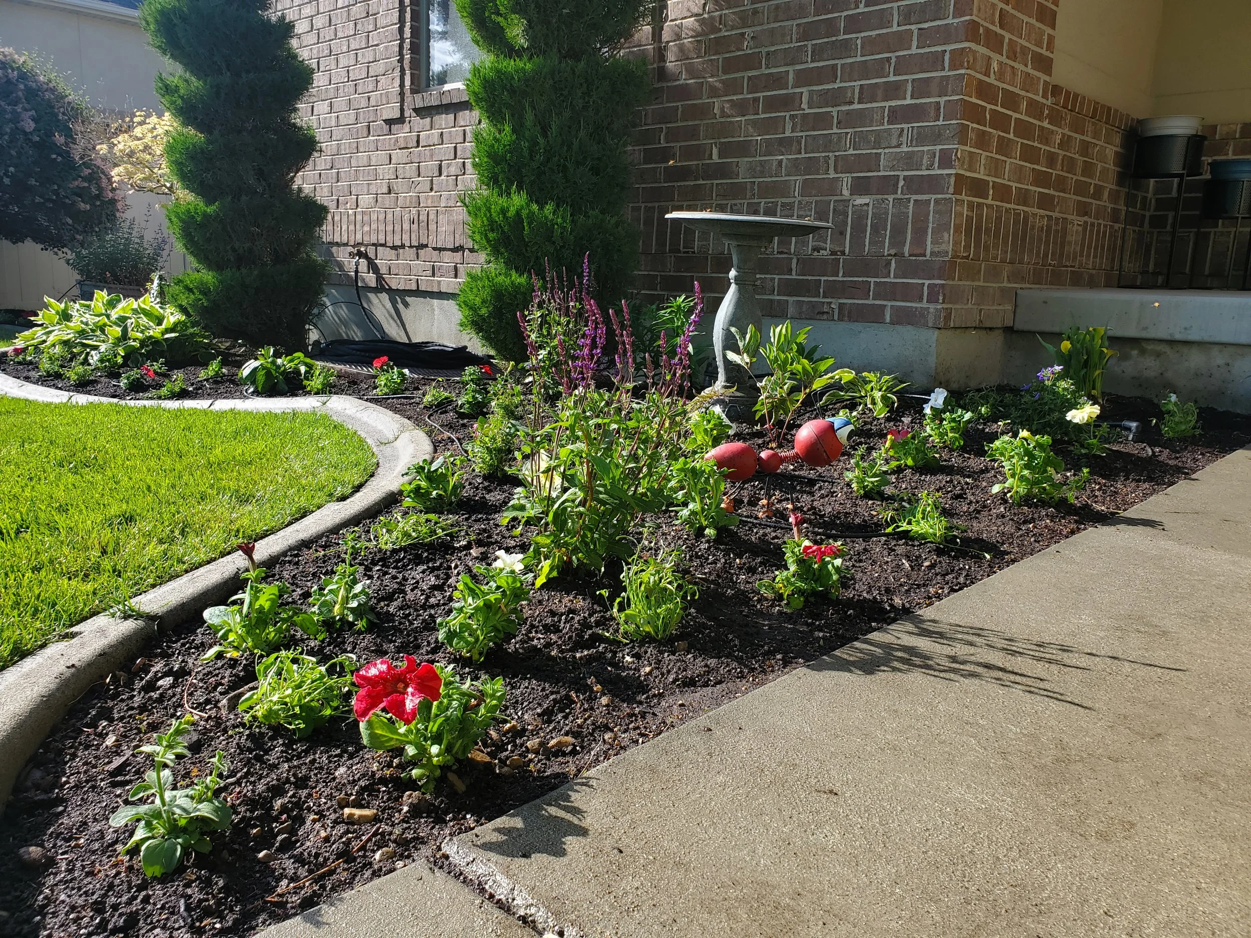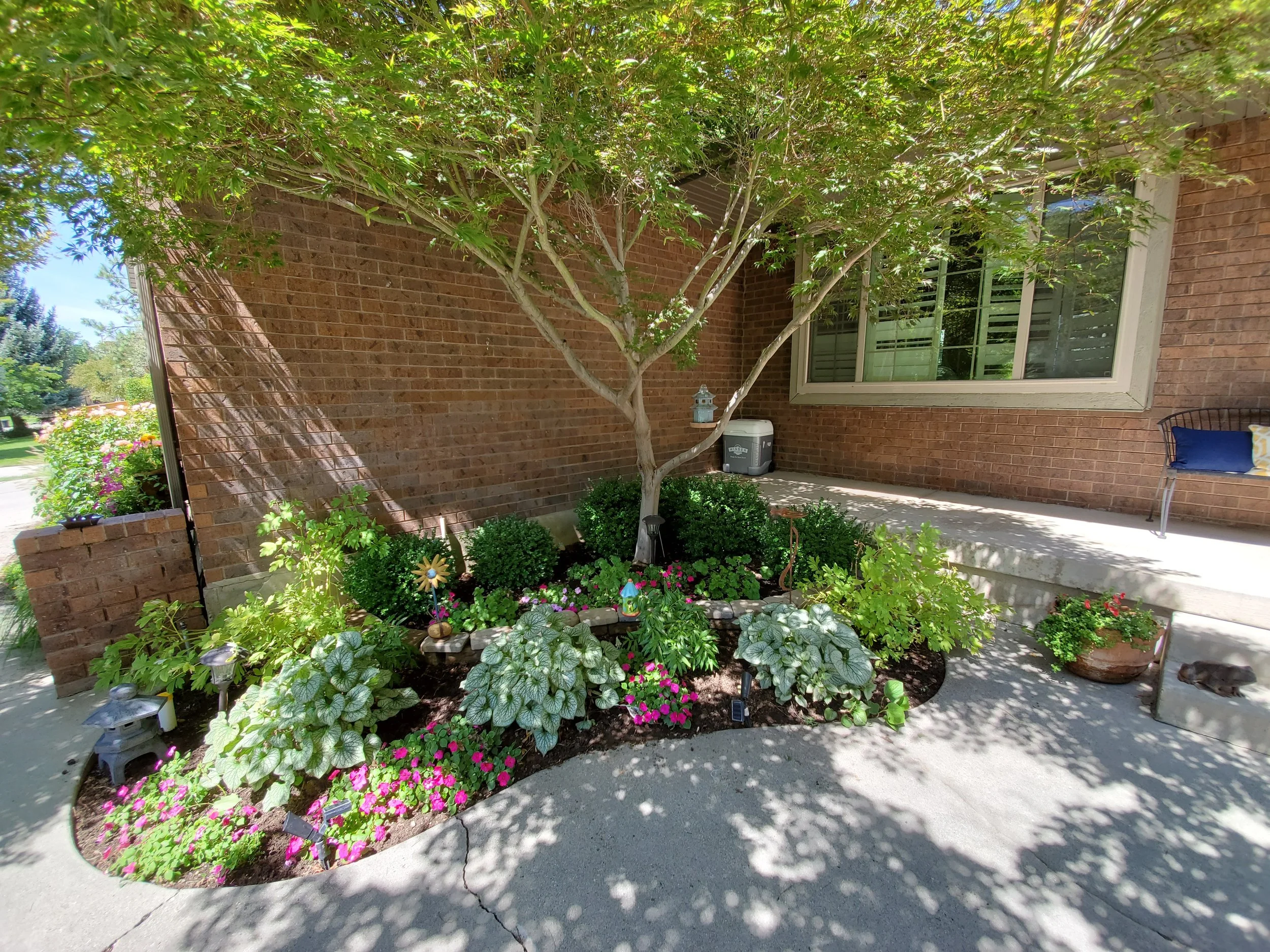 We had the wonderful opportunities to do some flower bed re-designs at a few different properties. One of which was to completely revamp part of the front yard and the side yard to boost both beauty and function. The homeowner needed a pad and path that would make storing and moving her garbage cans easier. We created new flower beds and filled them with greenery and color with a couple of custom glazed pots for that extra little touch to elevate the space even more.