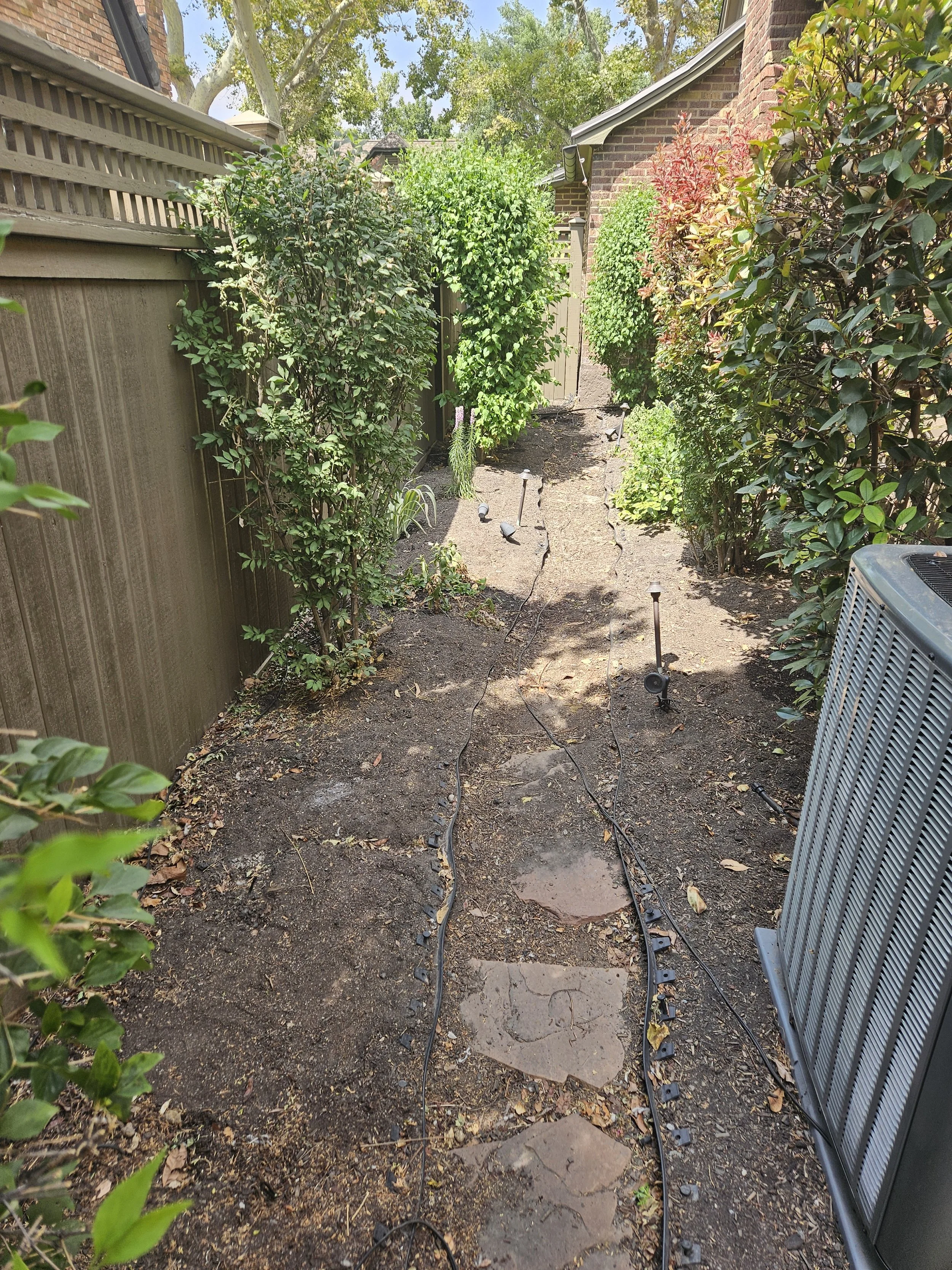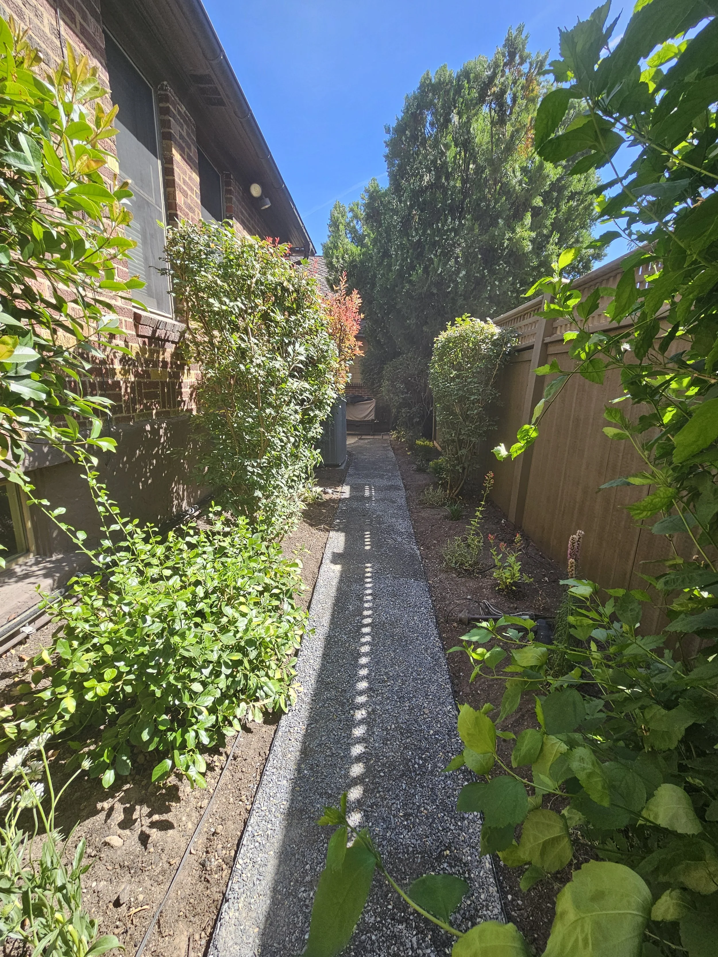We had a wonderful opportunity to give this side yard a much needed face lift. It involved running some conduit, new drip line system, steel edging, compacted chat path and new flower additions to provide an annual return of color year-round
